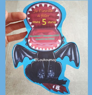 J'ai fait une carte avec un dessin numérique de Krokmou pour l'invitation, avec la bouche qui s'ouvre pour laisser découvrir le texte. Je voulais qu'il ait l'air mignon !